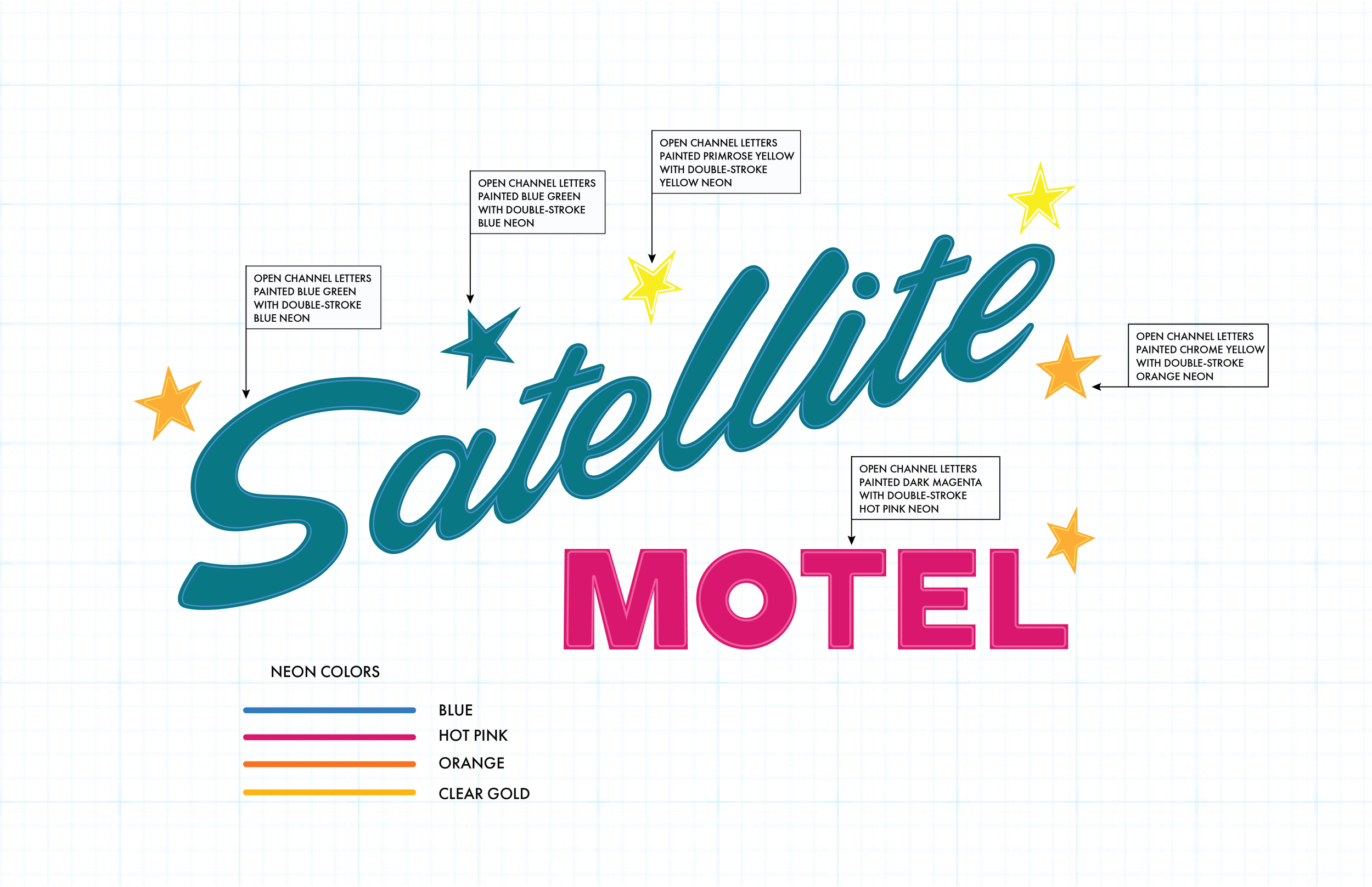 SATELLITE MOTEL — Nestled in Cocoa Beach’s famous "Motel Row," the Satellite Motel stands out with its distinctive atomic-age charm. The graphics department brought this retro gem to life with custom neon signage, perfectly capturing the kitschy, vibrant spirit of the era.